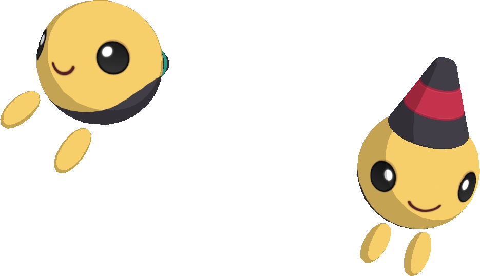 0b10 is a single Temtem composed of two independent bodies working together. Like its pre-evolution, both entities have spherical yellow bodies, with free-floating yellow hands, two large, beady eyes, and a smiling mouth. Both bodies also have black underbellies, and black cones protruding from their head. One body has a single cone protruding from the back of its head, with a turquoise stripe around the middle. The other body has two cones: one at the back of its head and another on its forehead, each of which has a red stripe around its middle.