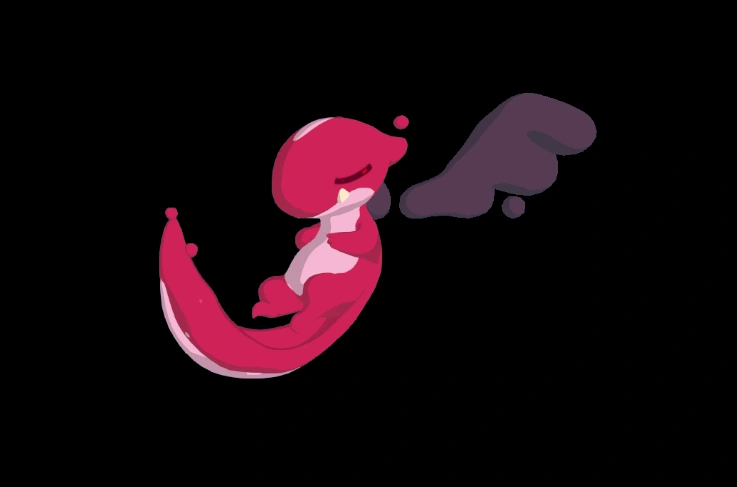 Adoroboros is a primarily pink Temtem that appears to be made of a liquid or gas. It is hot pink with a pale pink underbelly, back stumps, lower jaw and oval on its forehead. It has two short, fat arms and two stubby legs. Its mouth has two pointy white teeth sticking out of its lower jaw, and its eyes appear to be permanently closed. Floating behind its back are a pair of dark purple wings. Its tail appears to be flexible, as it can wrap it around itself.