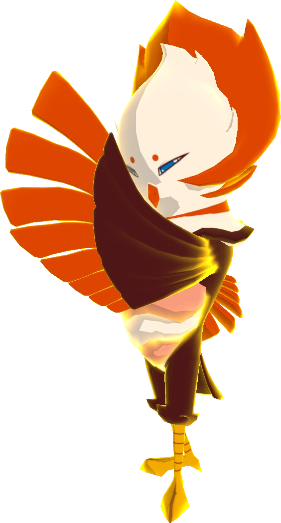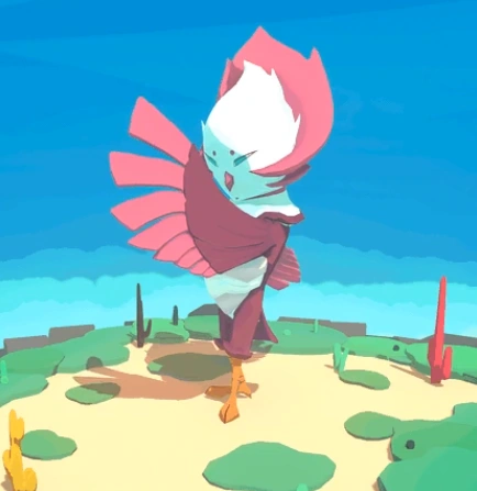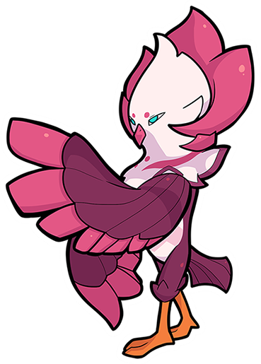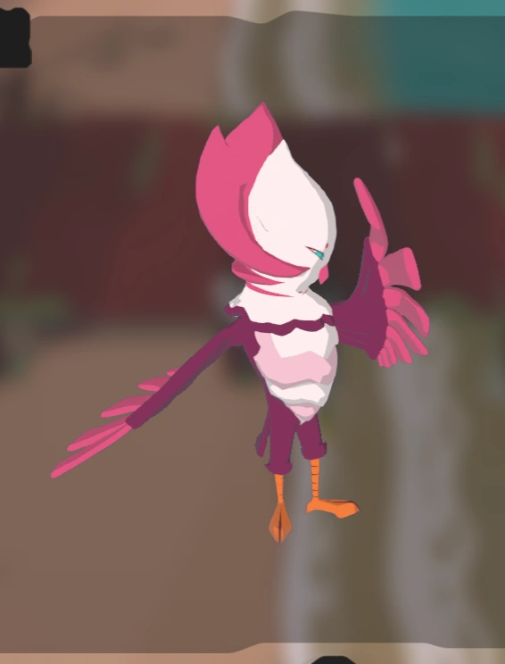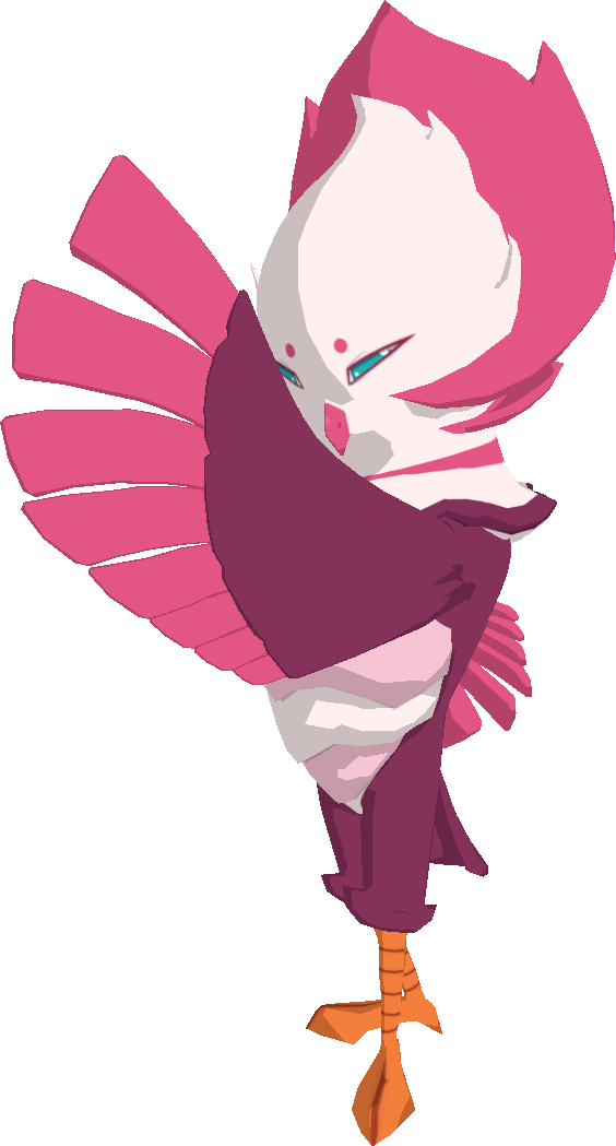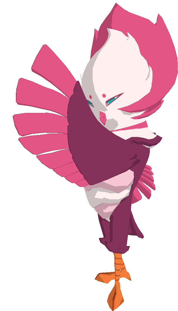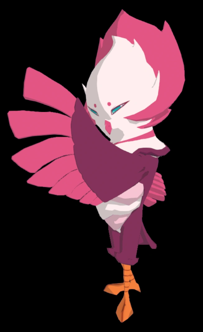 Barnshe is a bird Temtem that is predominantly fuchsia. It has a white stomach and a white head with a pink crown. The tips of its wings and its beak are pink as well. It has orange claws, very sharp, completely blue eyes, and two small dots for eyebrows.