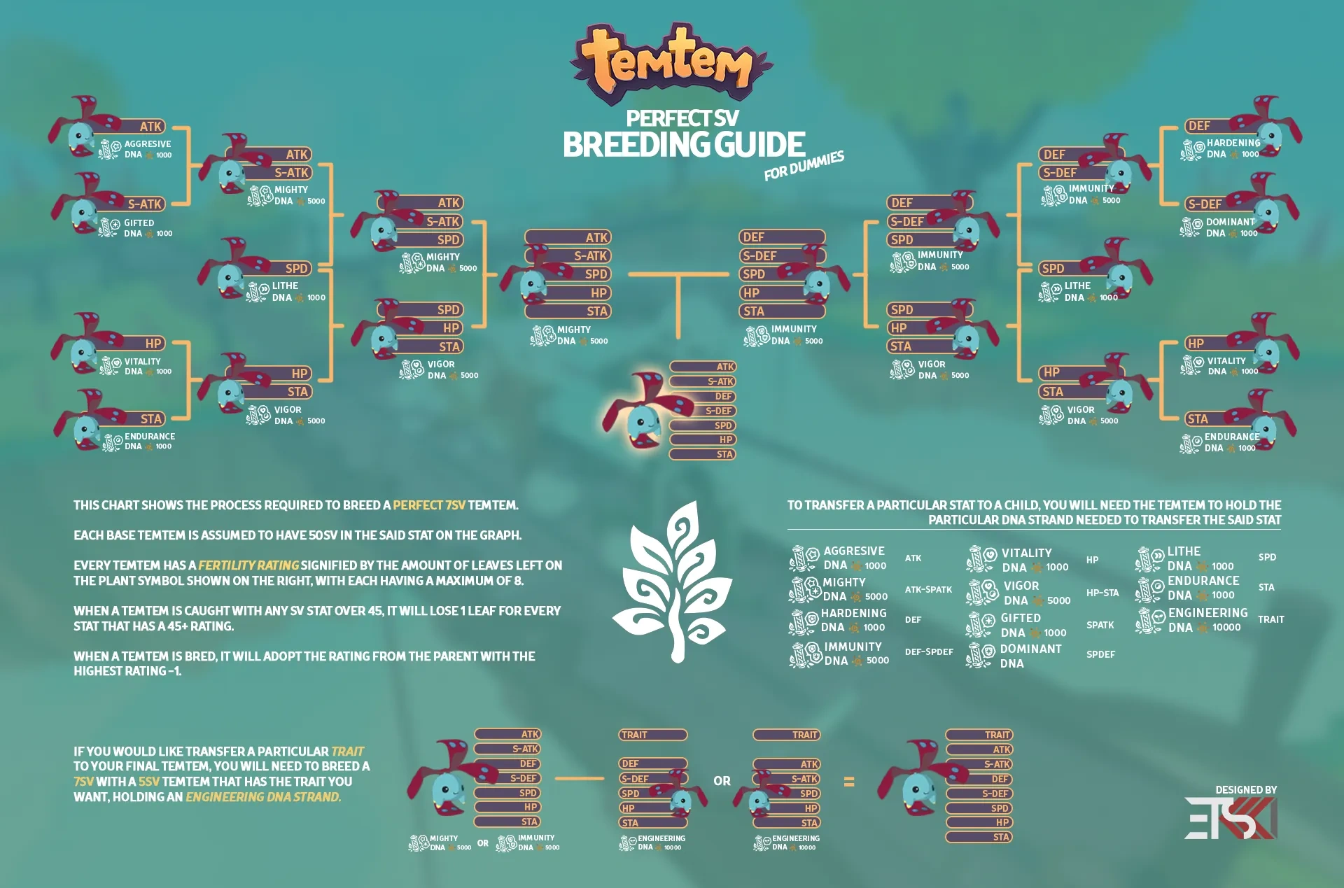Various ways to create perfect Temtem over multiple iterations of breeding exist, depending on the maxed SVs of parent Temtem, their remaining fertility, the desired traits, and compatible DNA Strands. The general idea is to use gear for maxed SVs that are not shared between the two parental Temtem, to ensure the highest number of maxed SVs on the offspring. An example is displayed on the right.