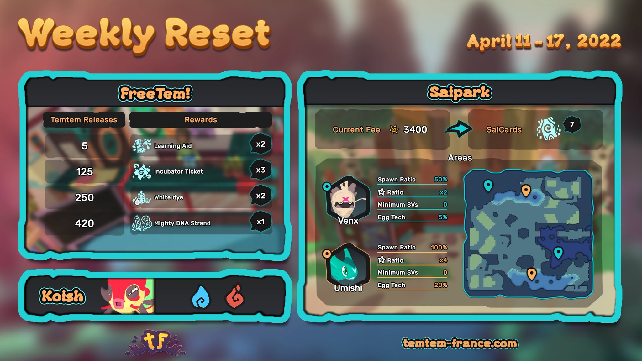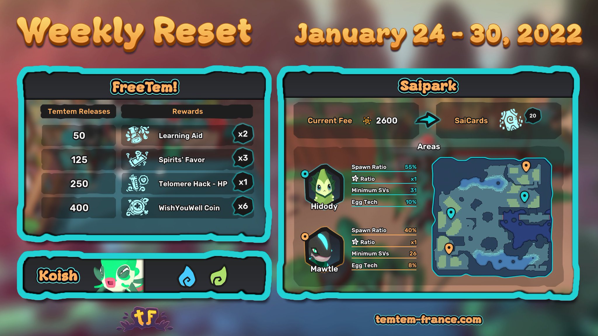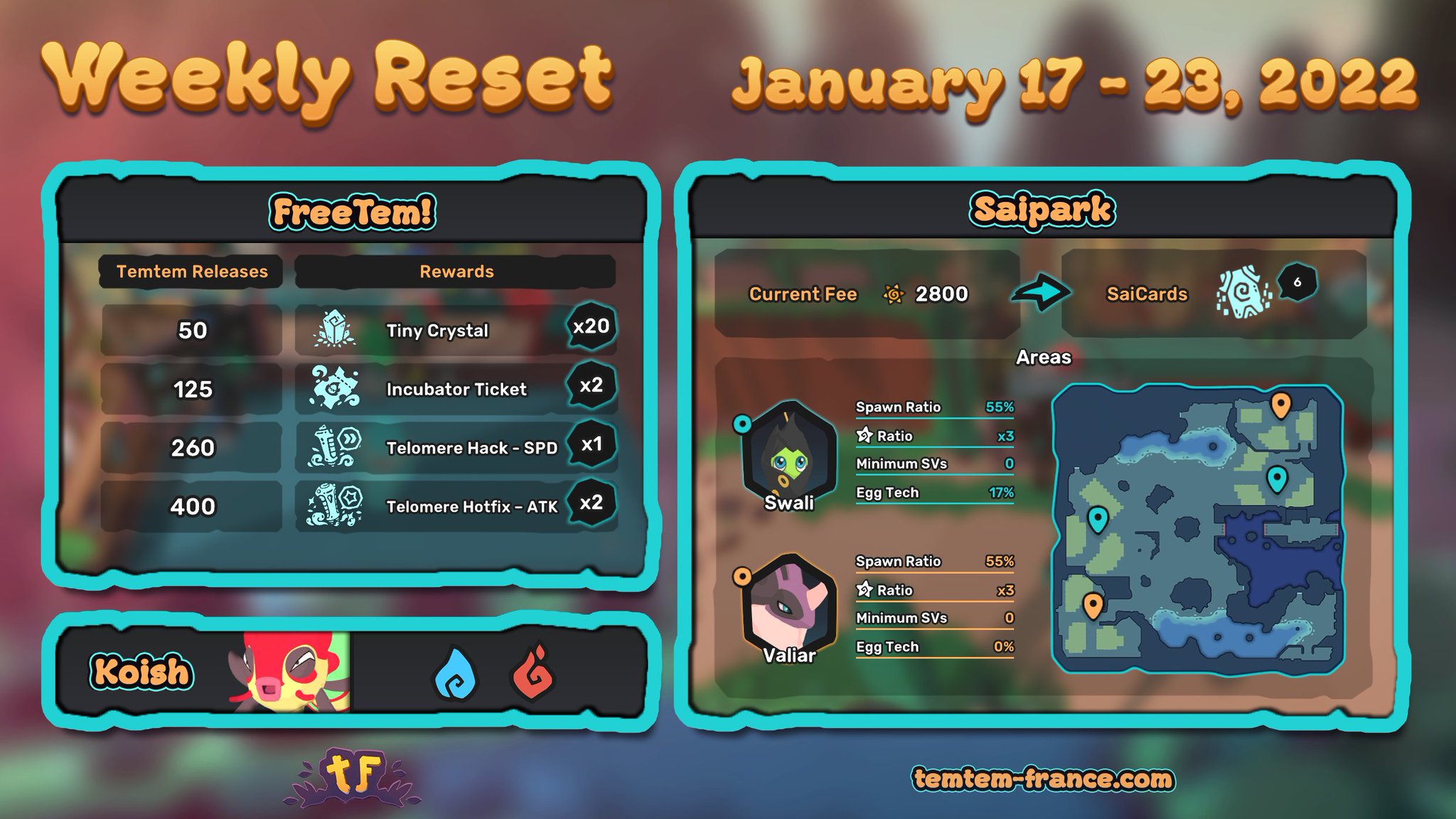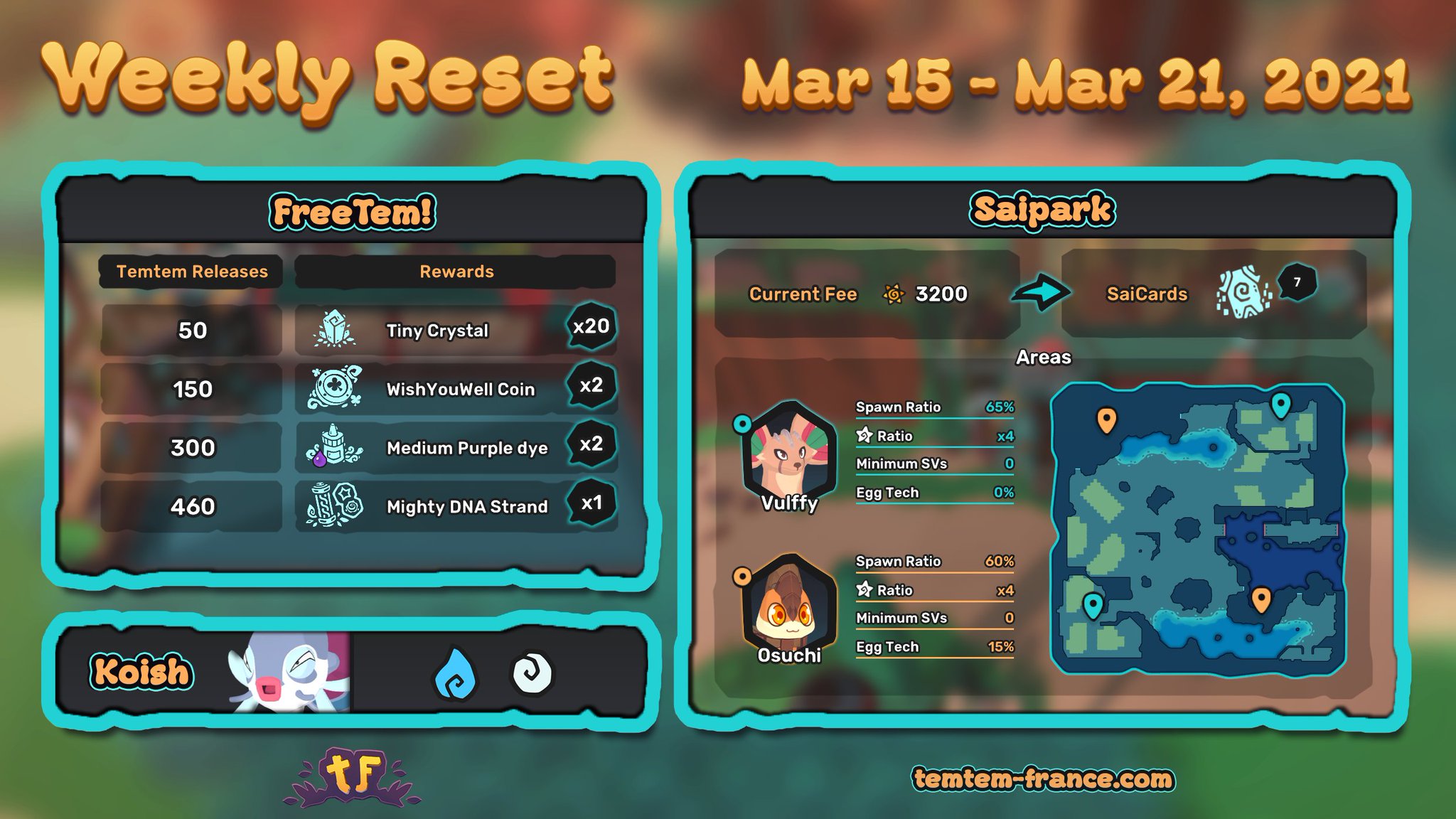 For the tiered weekly rewards, the player is required to release a specific amount of Temtem in the same week. The released Temtem must be released by the Original Tamer to count towards the reward or to give Pansuns. The releases do not carry over to the next week, so the rewards need to be retrieved before the weekly reset. This happens every Monday at 08:00 UTC (Coordinated Universal Time). Rewards include Items and Cosmetics.