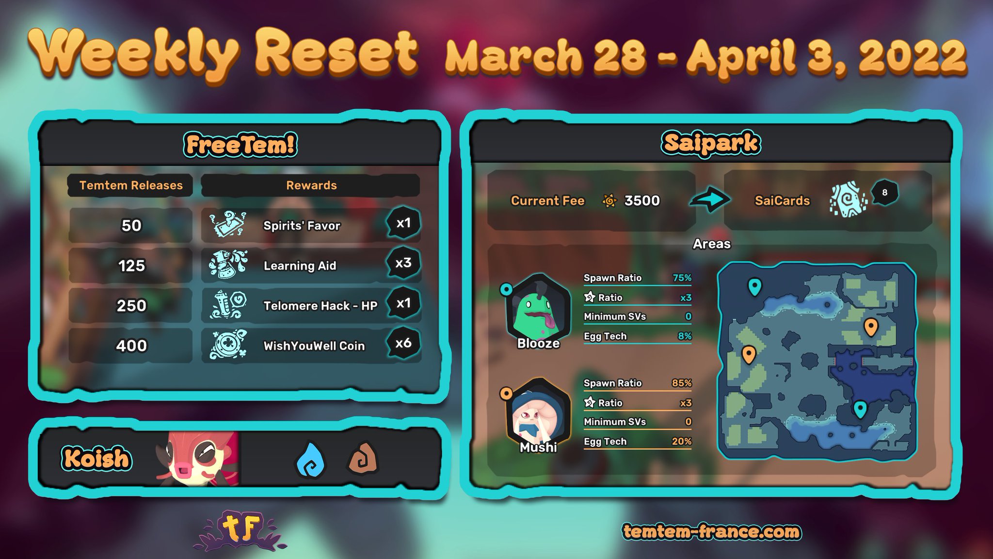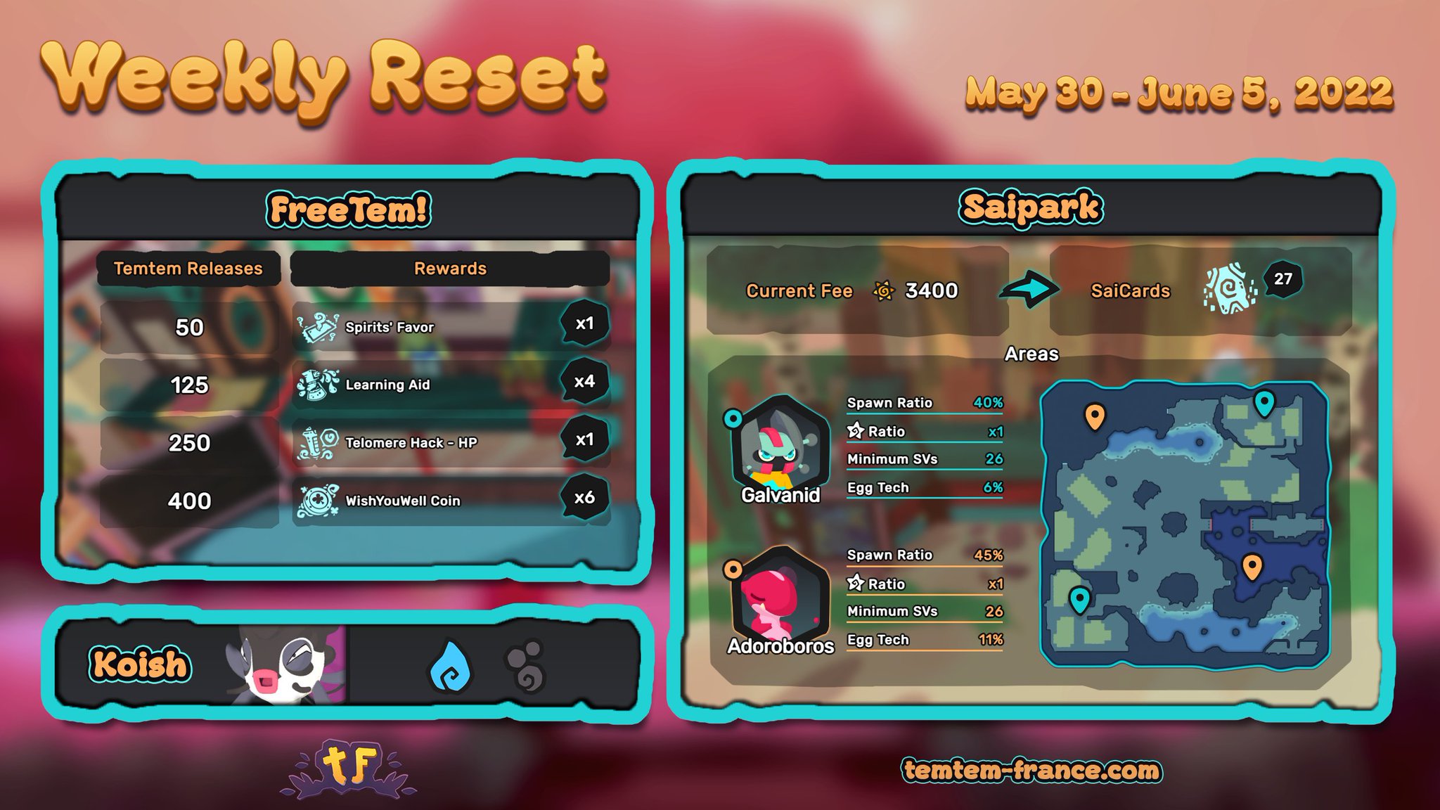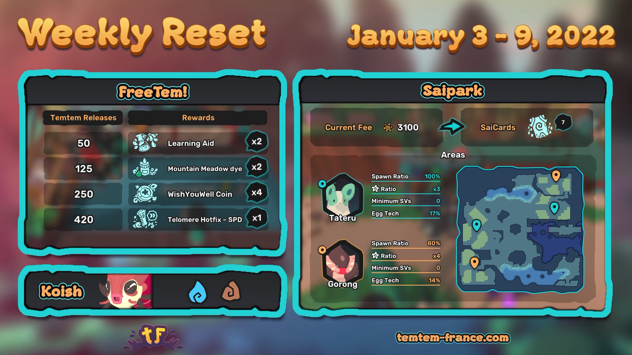 For the tiered weekly rewards, the player is required to release a specific amount of Temtem in the same week. The released Temtem must be released by the Original Tamer to count towards the reward or to give Pansuns. The releases do not carry over to the next week, so the rewards need to be retrieved before the weekly reset. This happens every Monday at 08:00 UTC (Coordinated Universal Time). Rewards include Items and Cosmetics.