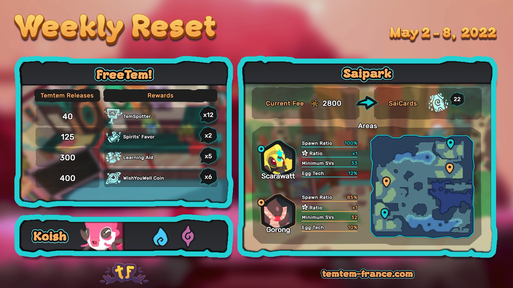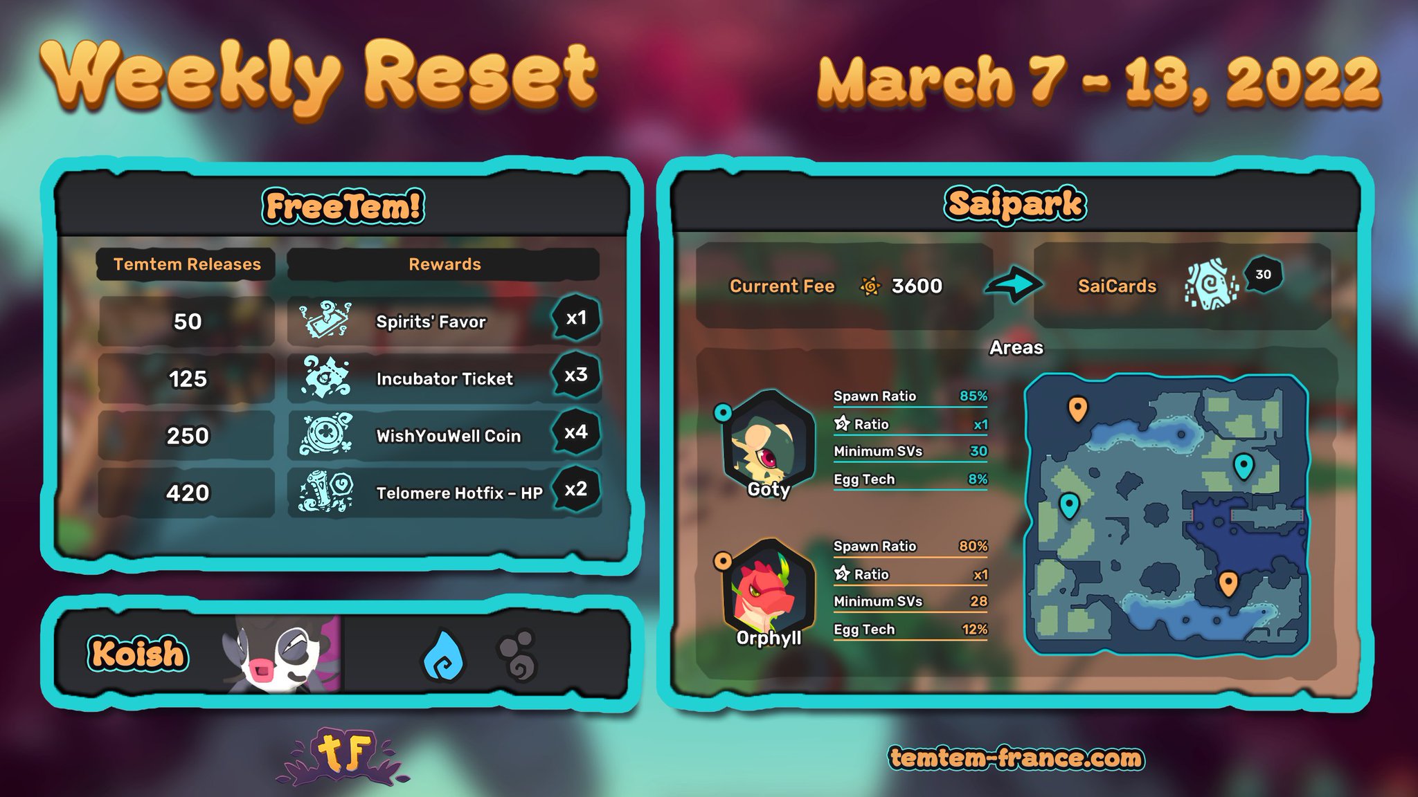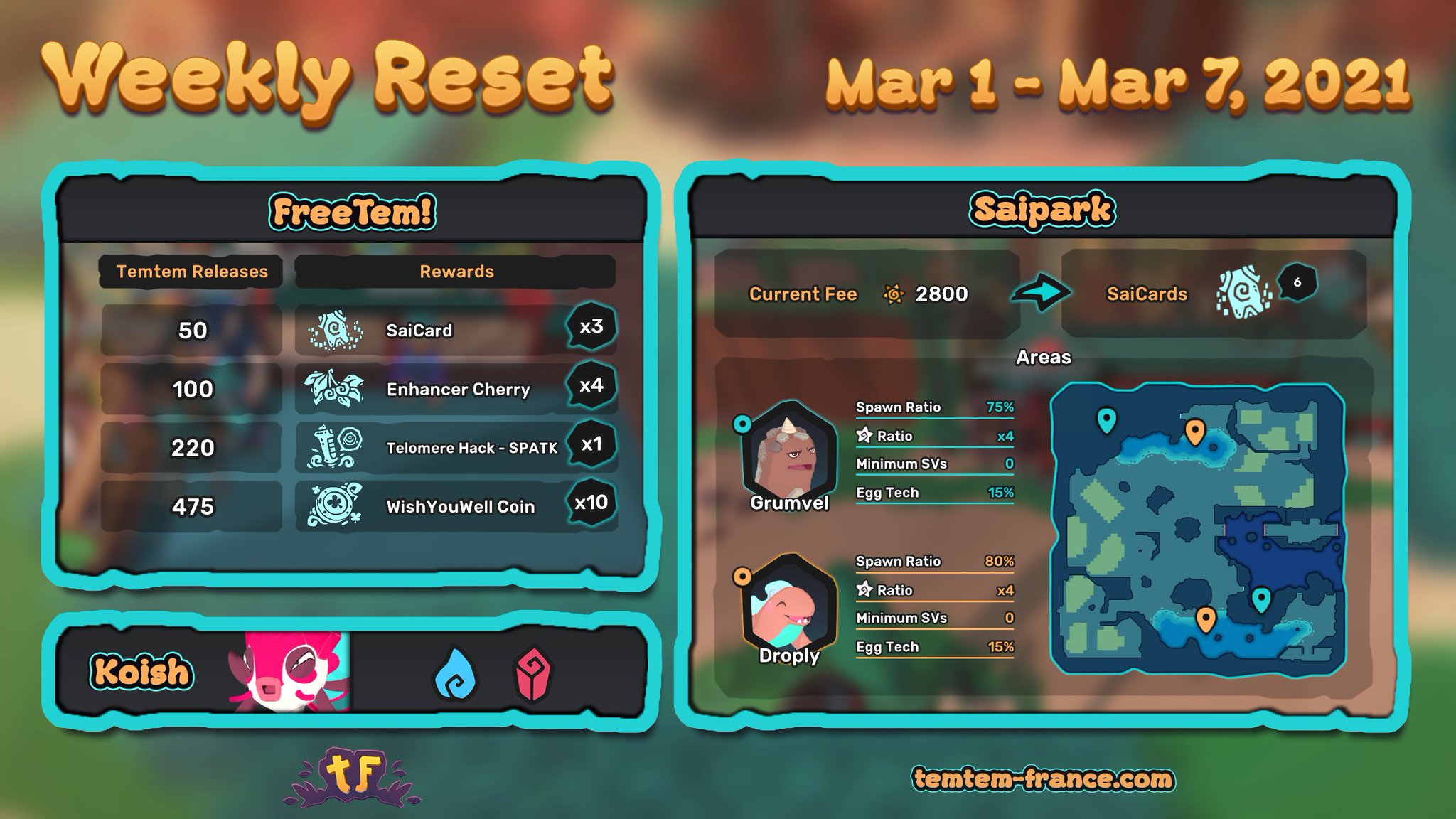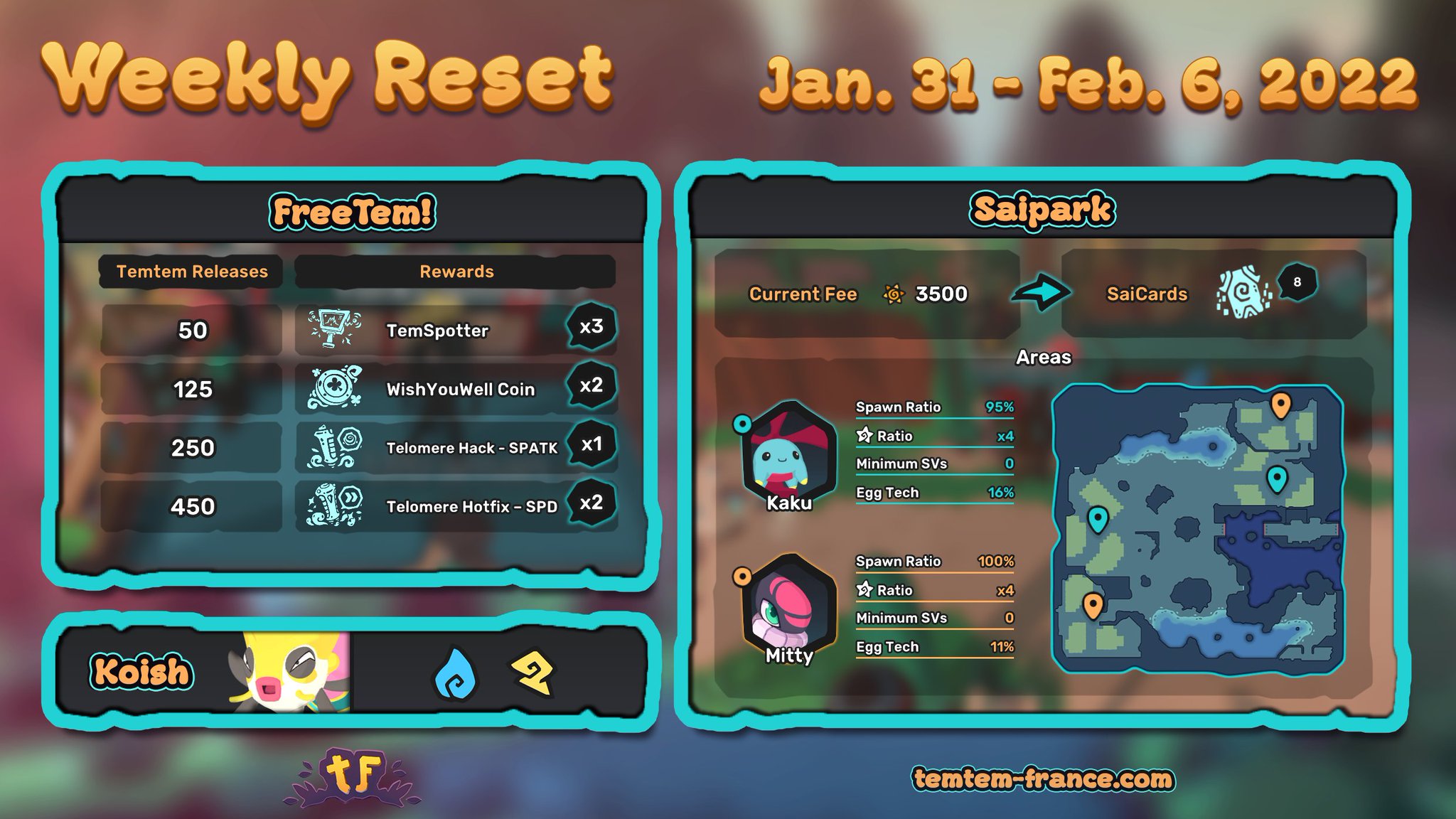 For the tiered weekly rewards, the player is required to release a specific amount of Temtem in the same week. The released Temtem must be released by the Original Tamer to count towards the reward or to give Pansuns. The releases do not carry over to the next week, so the rewards need to be retrieved before the weekly reset. This happens every Monday at 08:00 UTC (Coordinated Universal Time). Rewards include Items and Cosmetics.