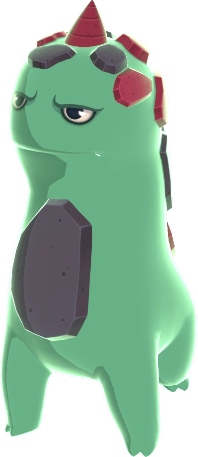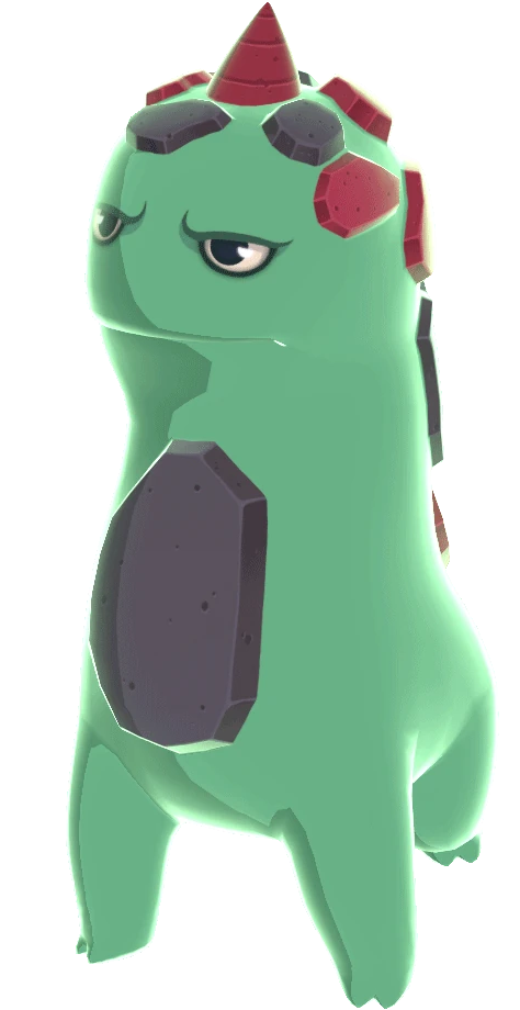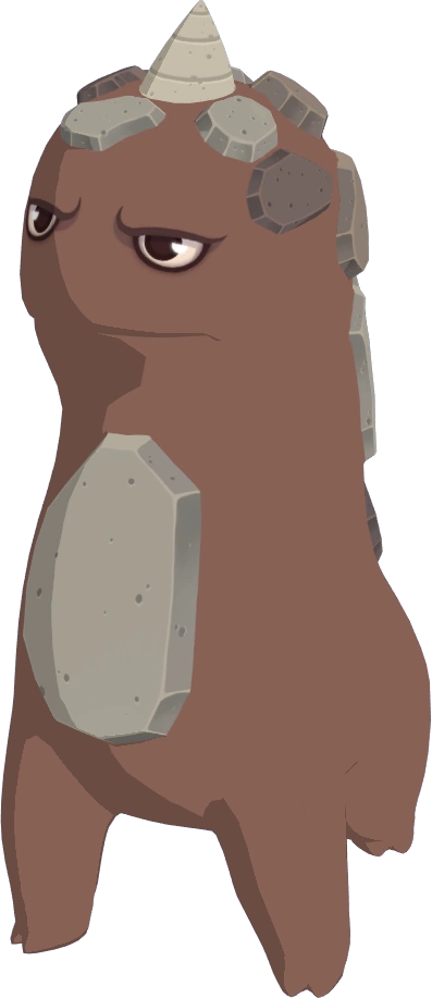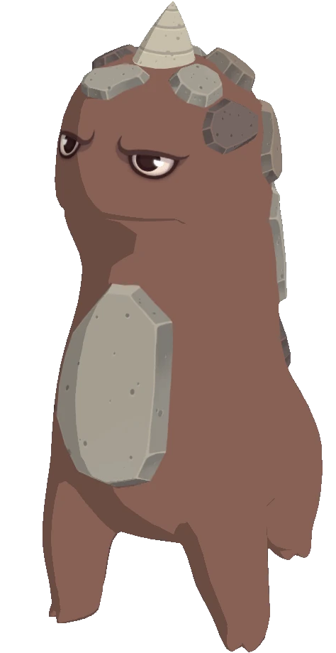 Grumvel is an oddly-shaped oblong quadruped with no arms. Its body is brown colored, resembling the color of dirt, with variously grey-colored rocks acting as plating along its back and one large stone plate on its stomach. Furthermore, a short horn-shaped stone is on the top of its head. Its stubby legs and small feet, which have two small toes each, make it look as if it is constantly wobbling. It has dark brown eyes and furrowed brows, giving Grumvel a permanently grumpy look.