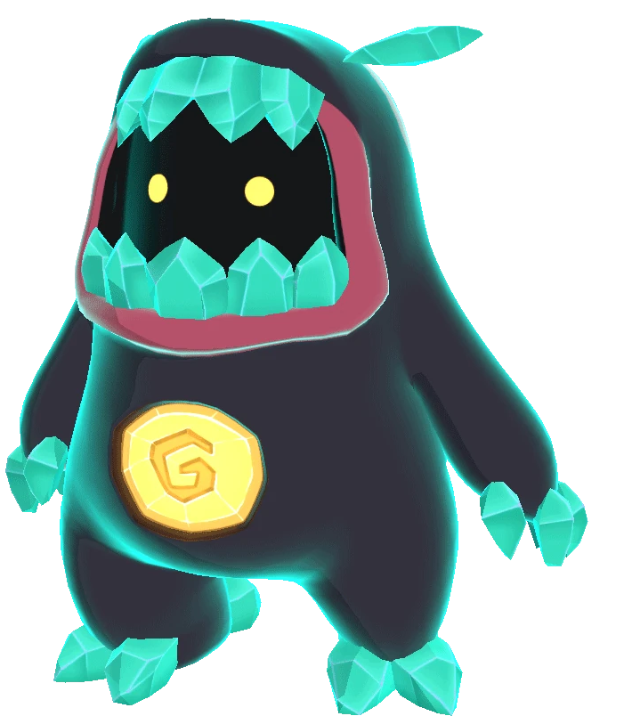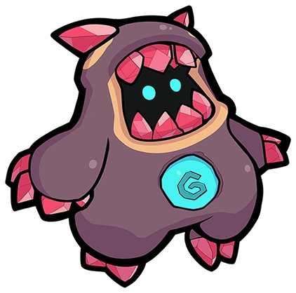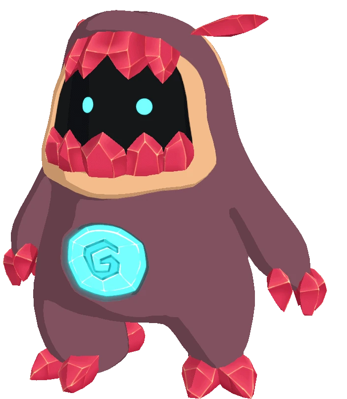 Occlura is a short and stout biped Temtem with a primarily red-brown coloration. Its face resembles a wide, gaping mouth with a black interior, containing 2 glowing blue eyes. Embedded on its chest is a light blue stone with a swirl pattern. It has red crystals on several parts of its body, making up 2 small horns, large "teeth" on its face, and claws on its arms and legs.