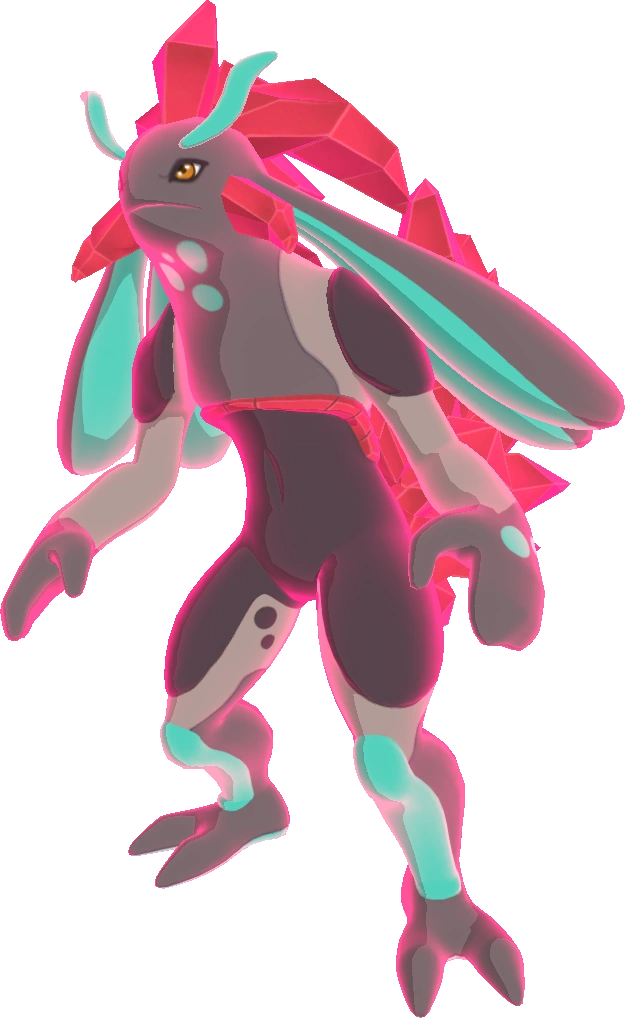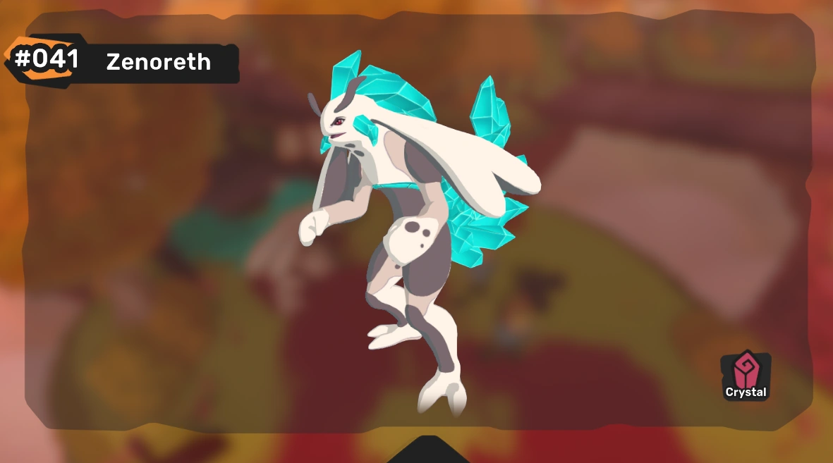 Towering crystalline behemoths, Zenoreth are bipedal Temtem with a light cream colored body that is covered in dark brown stony plates on its shoulders, lower torso, thighs, and shins. Dark brown spots are also present on its hands, inner legs, and the underneath of its neck. Its torso is wrapped in a cyan crystalline belt that travels down towards its tail. Most of its arms and part of its legs are colored a darker cream than the rest of its body. Its hands only have discernible thumbs, and its feet consist of two large diverging raptor-like toes. Its head is very rounded with garnet eyes and protruding dark brown S-shaped eyebrows. On its cheeks are two cyan crystals mimicking small tusks. Two very large ears with dark brown underneath are on each side of its head, and multiple protruding crystals extend from its head, down its back, and to its tail, which is an extremely large amalgamation of cyan crystals.